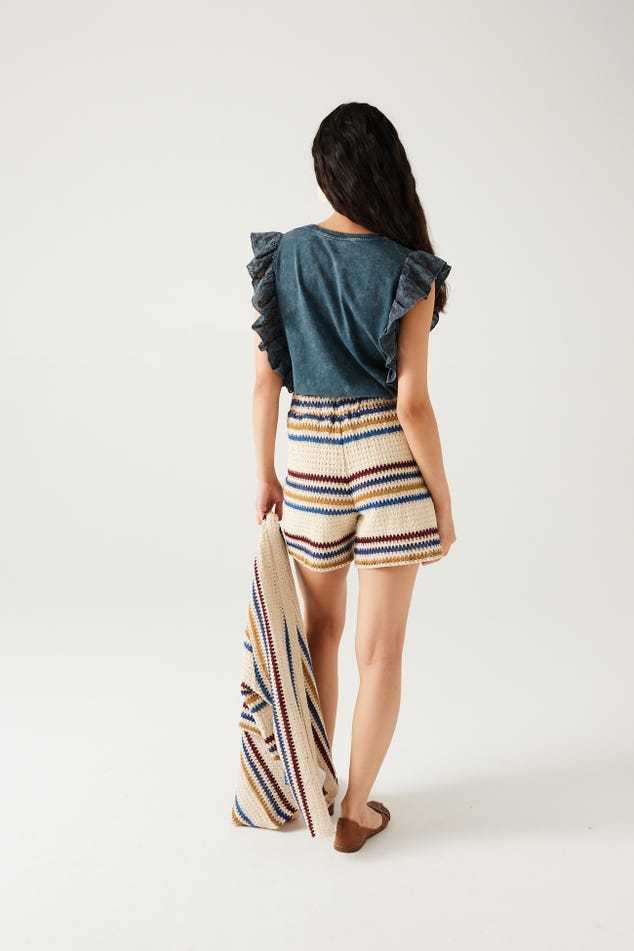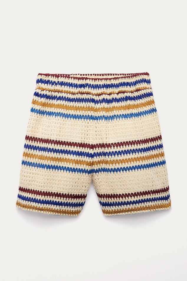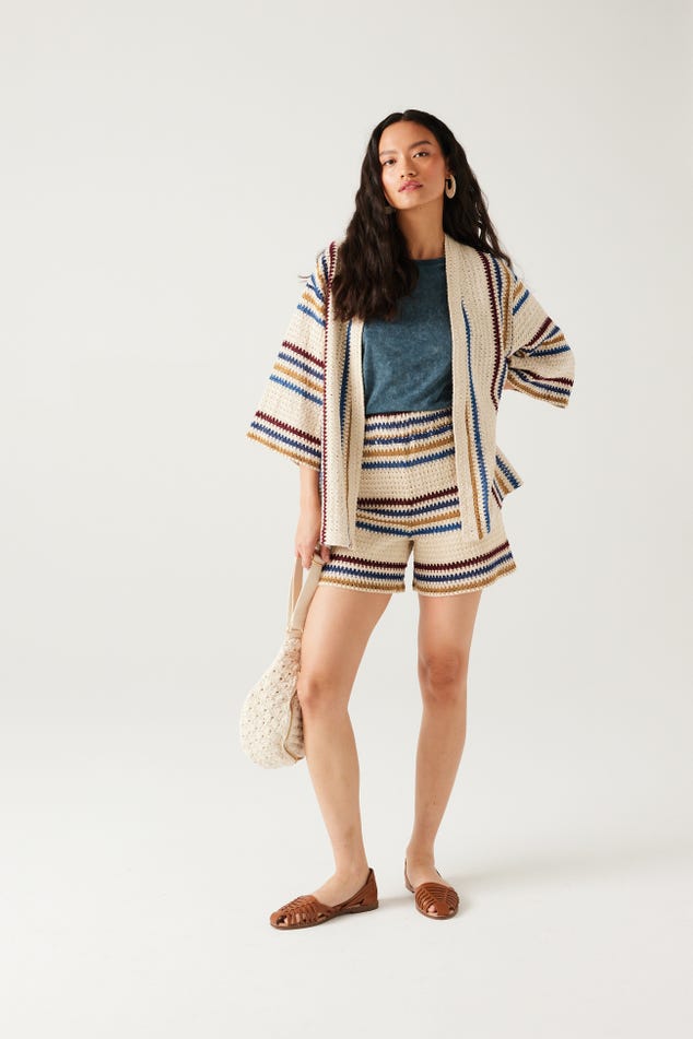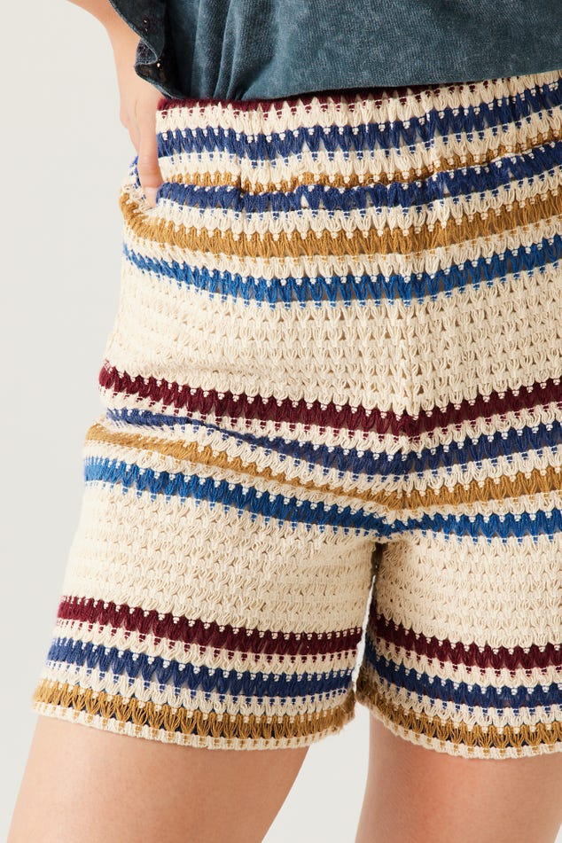 Notes hippies ! Le crochet prend des couleurs et joue avec des rayures pour donner à ce short un style seventies cool ! Il est doublé en voile de coton ton sur ton. On l'imagine déjà pour aller partager un cocktail en terrasse, ou pour défiler sous le soleil des vacances. Maille fine. Taille haute élastiquée.
