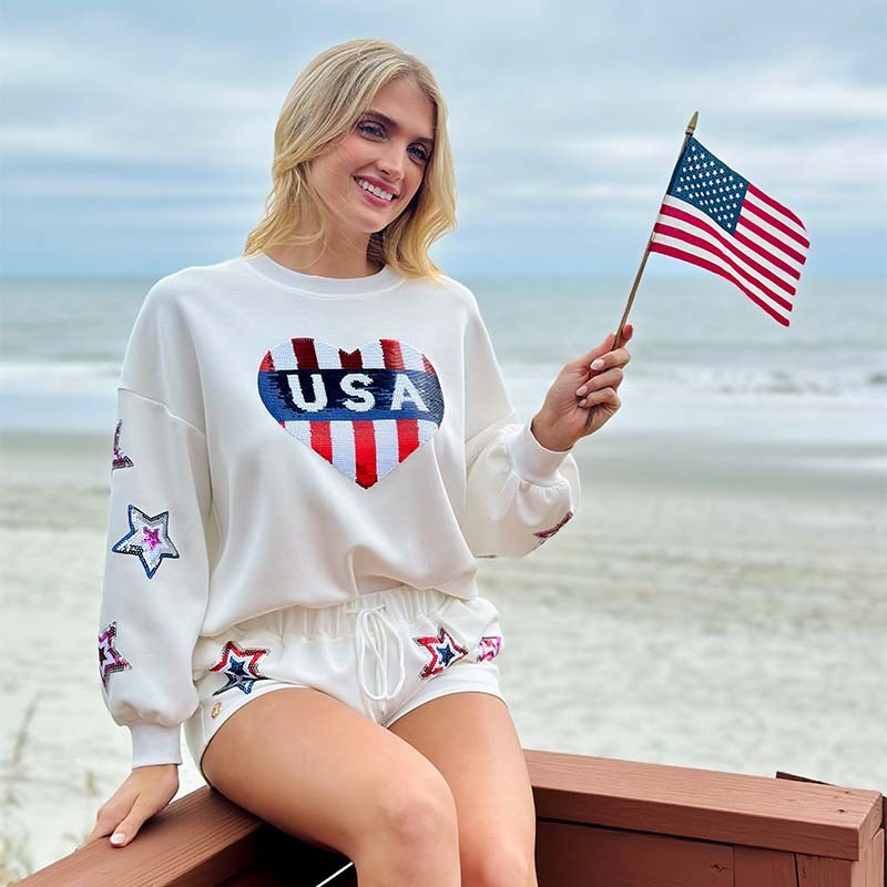 These super soft shorts are complete with a drawstring closure and a 'Merica lovin' sequin design. Perfect for a chilly night on the beach or by the pool.