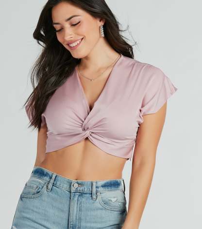 Create the cutest casual look that brings the sweet vibes in this twist-front satin crop top! Made with a silky-sleek satin woven fabric, this top features a V-neckline with a trendy twist-front design, short flutter cap sleeves for an effortless flair, and a cropped form-hugging fit to showcase your figure. Style with and clear-heeled mules.