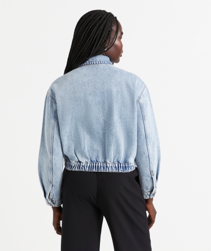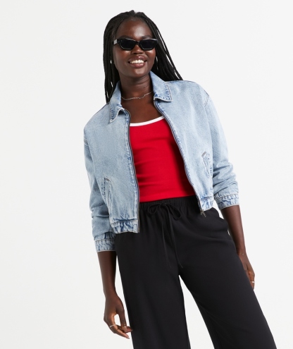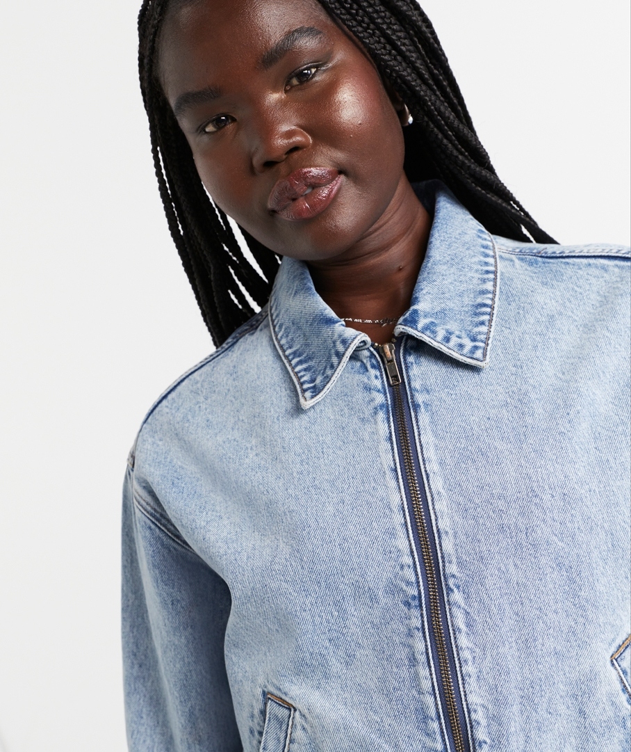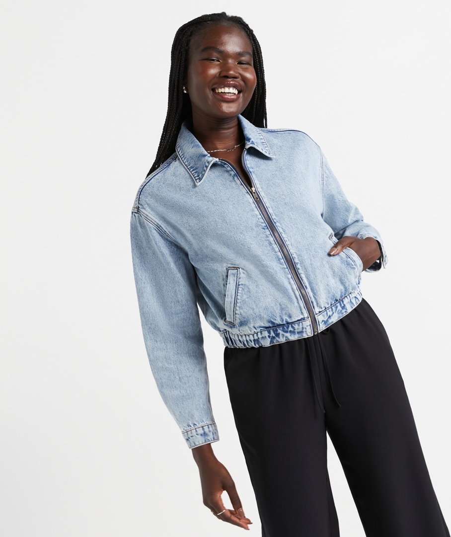 Elevate your wardrobe with The Denim Bomber Jacket this season! Designed in a bomber shape, cropped length, long sleeves, zip closure down the front, side pockets, and a collar. It's the perfect jacket to wear over your fave graphic tee or lightweight knit. Pair with a skirt or jeans, and accessorise with statement jewellery.