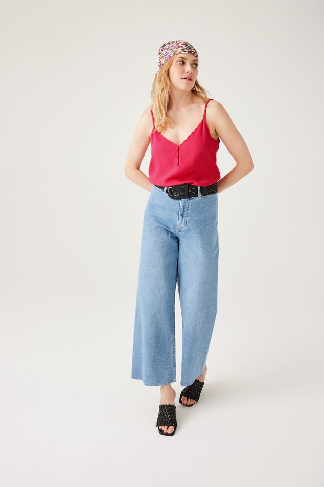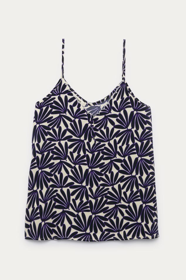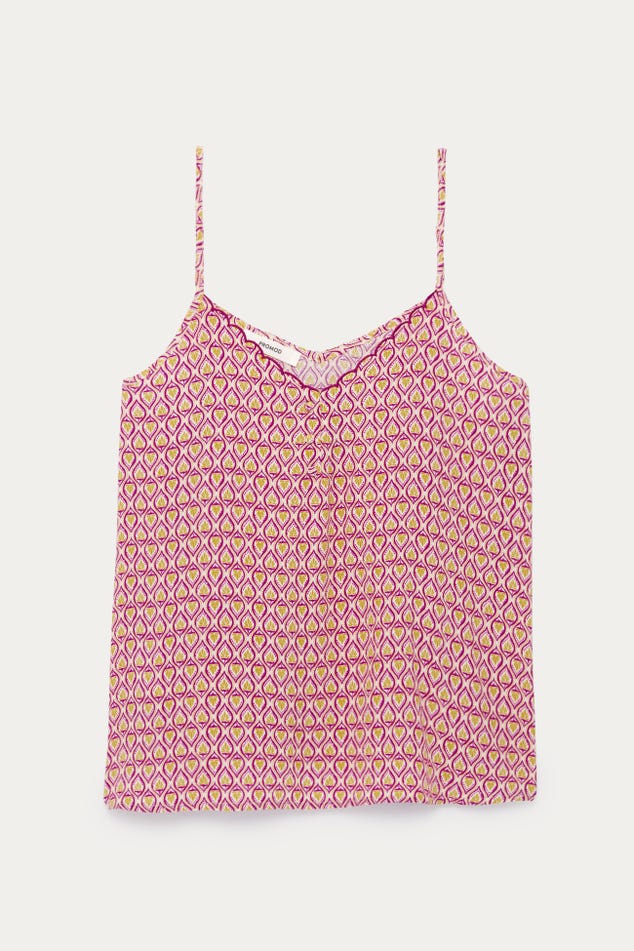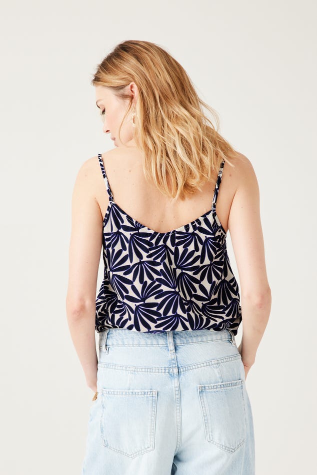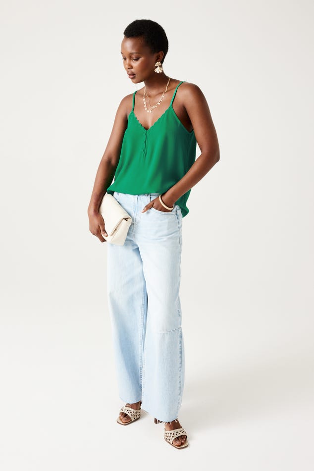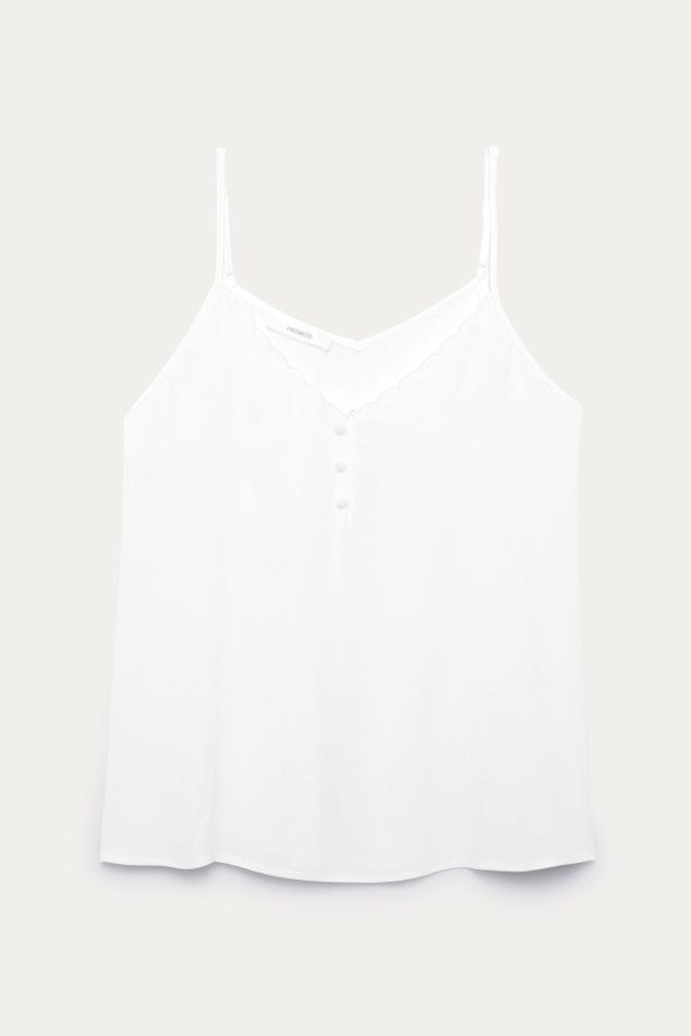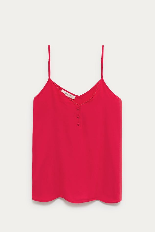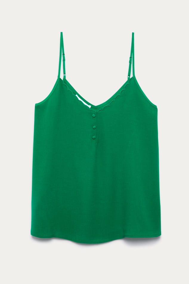 Ce caraco a un joli sens du détail : un décolleté V à bords festonnés devant, des petits boutons enrobés, de fines bretelles ajustables... On aime aussi beaucoup le toucher crêpé. Coupe droite. Décolleté V devant et dos. Base arrondie. Finition piquée. Cet article contient de la viscose issue de pulpe de bois provenant de forêts gérées.