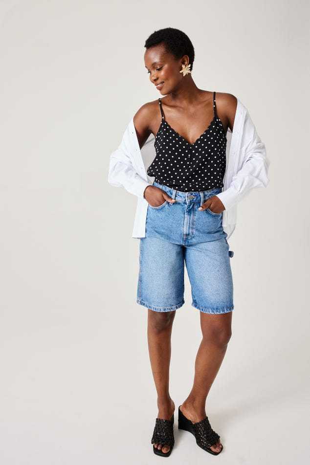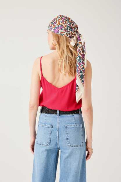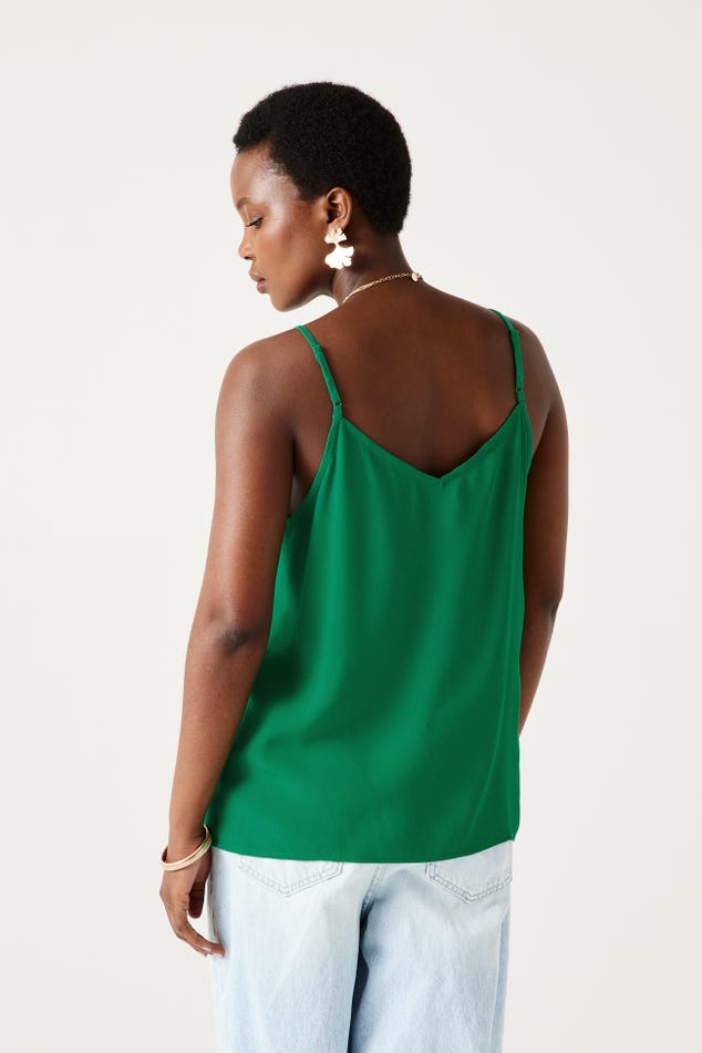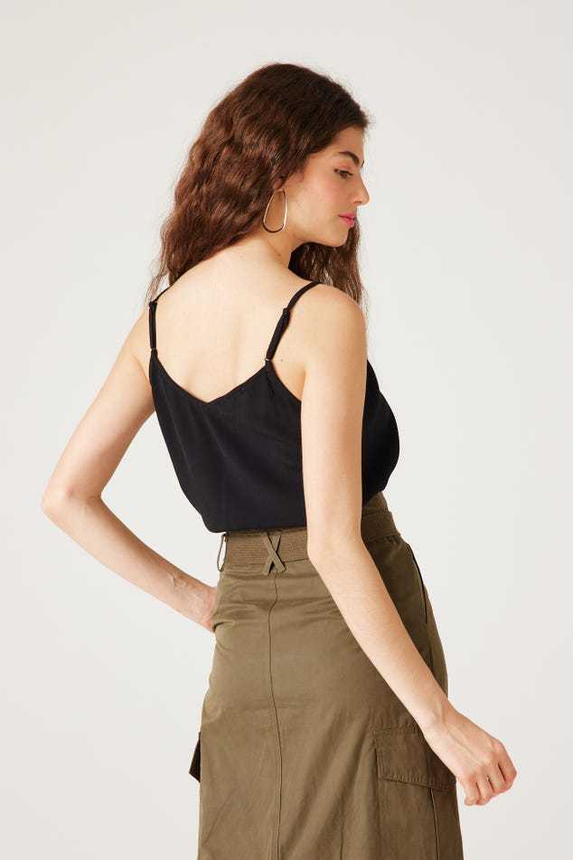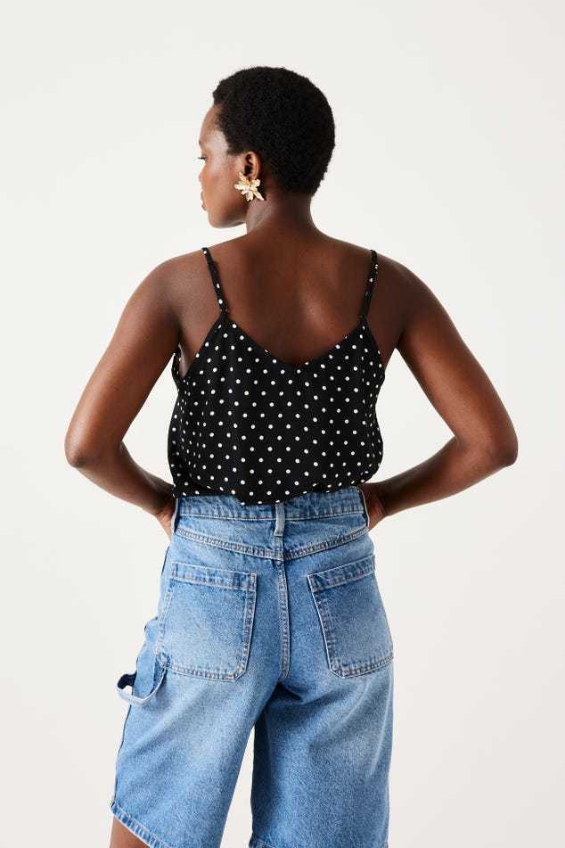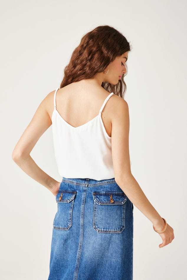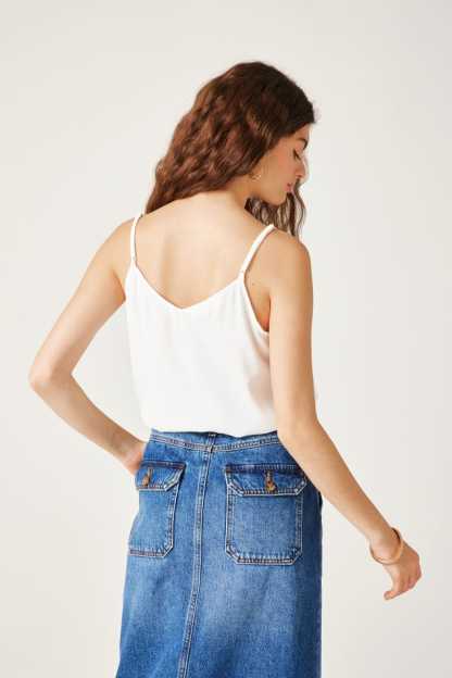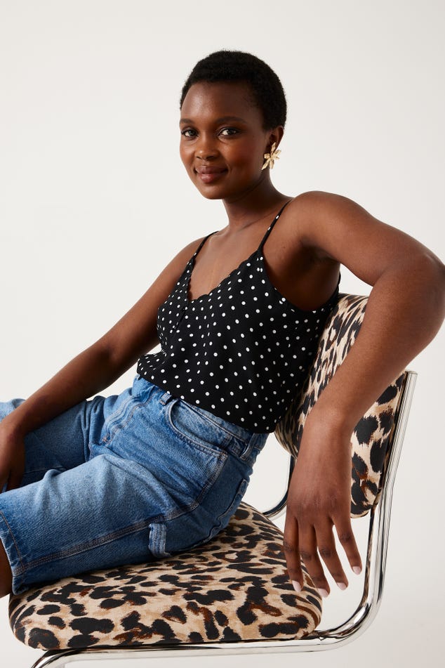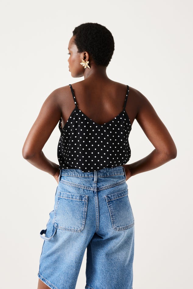 Ce caraco a un joli sens du détail : un décolleté V à bords festonnés devant, des petits boutons enrobés, de fines bretelles ajustables... On aime aussi beaucoup le toucher crêpé. Coupe droite. Décolleté V devant et dos. Base arrondie. Finition piquée. Cet article contient de la viscose issue de pulpe de bois provenant de forêts gérées.