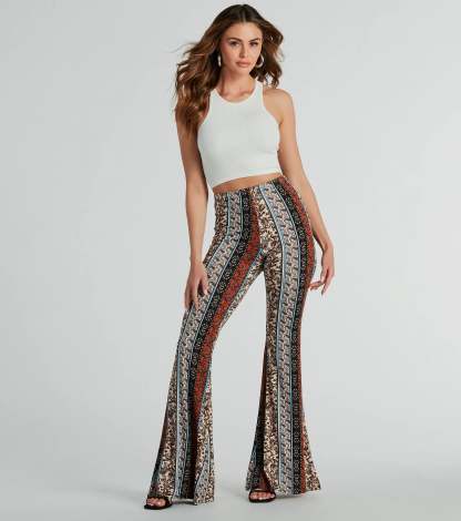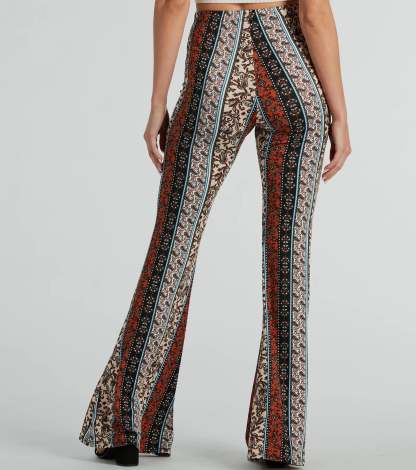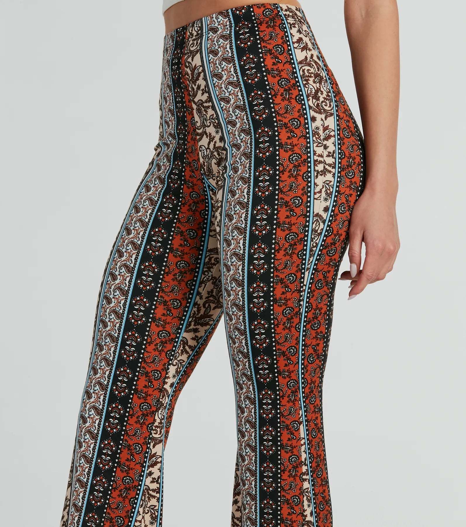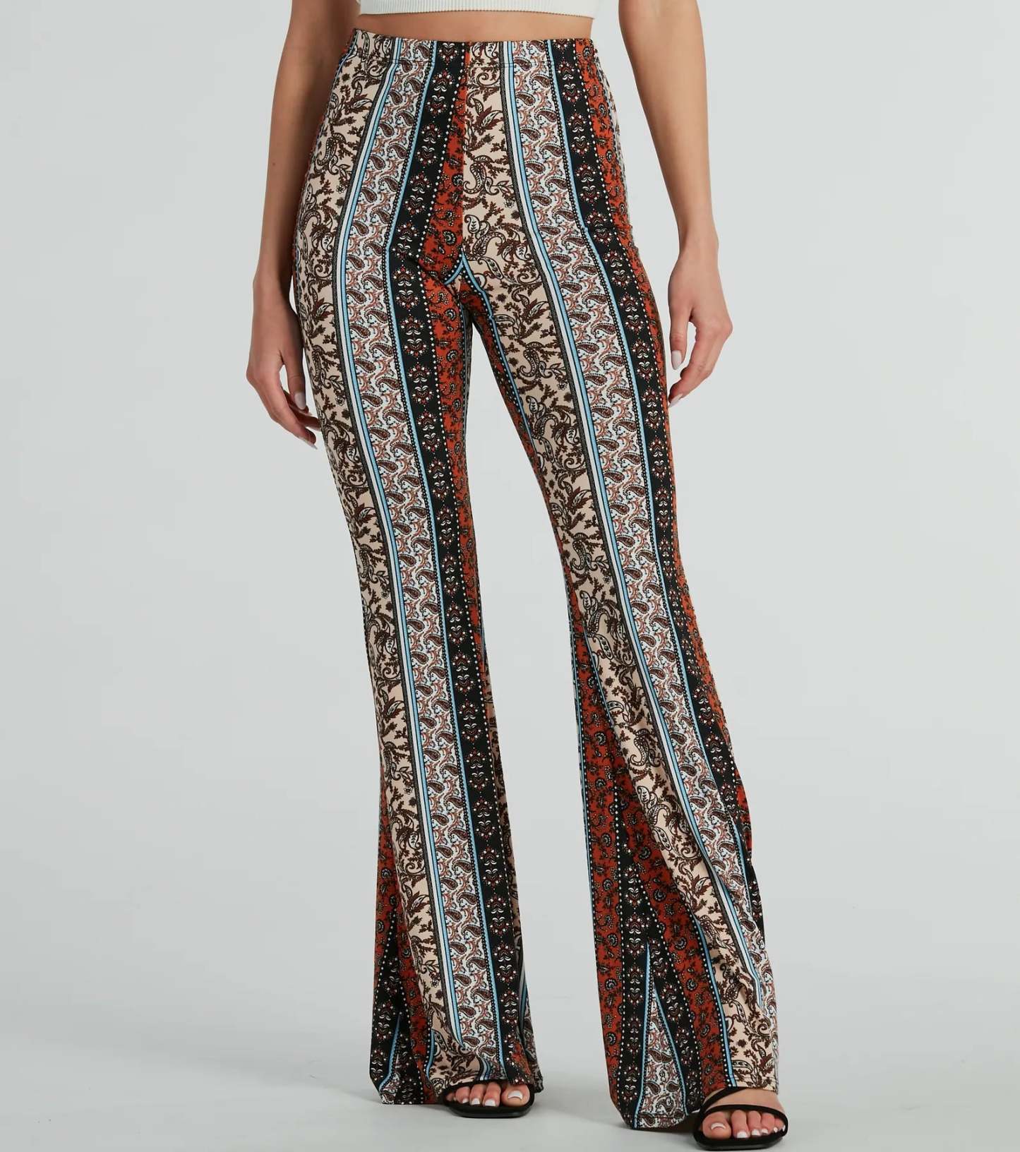 You'll be a wanderlust beauty in these paisley print flare pants, perf for creating a dreamy desert festival look! The soft and stretchy brushed knit fabric features a bohemian-inspired paisley print pattern for those effortlessly cool vibes. The high waist has an elastic band for comfortable wear. The hip-hugging fit continues through the leg, leading to a trendy flared hem. Style with a and ankle booties.