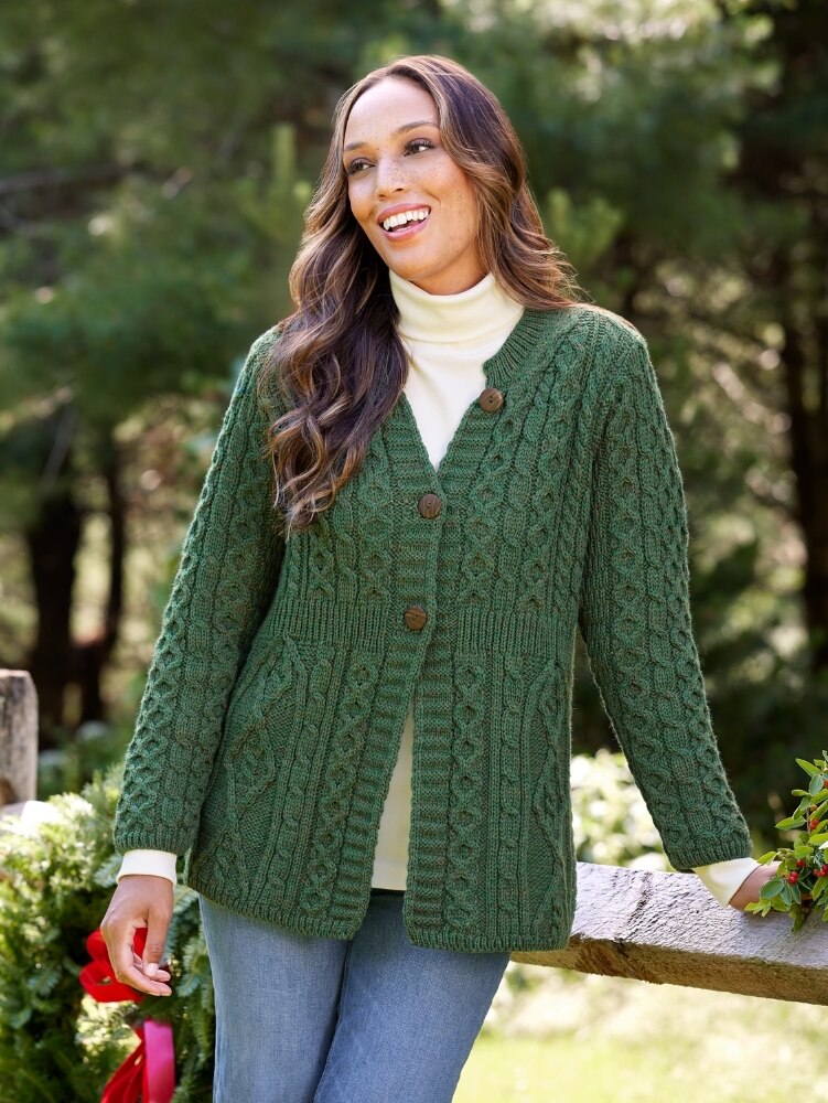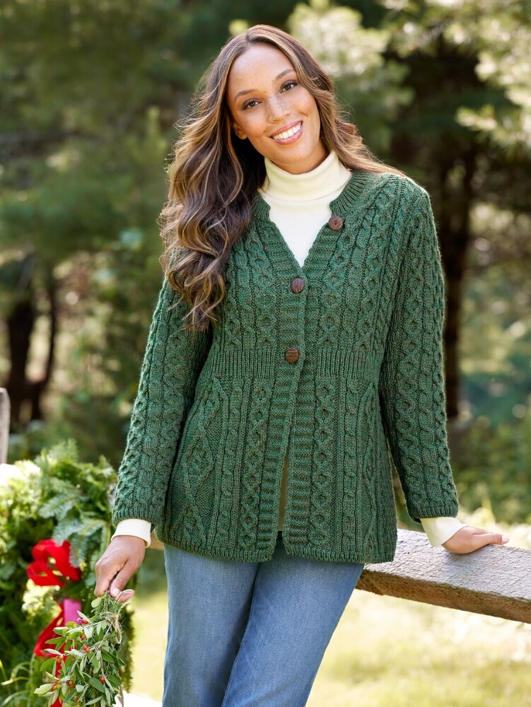 This beautiful cardigan is artfully knit in premium Merino wool with rows of traditional honeycomb, trellis, and Irish moss stitches, each thought to symbolize good luck and good fortune. It's styled with an Empire waist, which flares slightly to create a soft, relaxed silhouette.